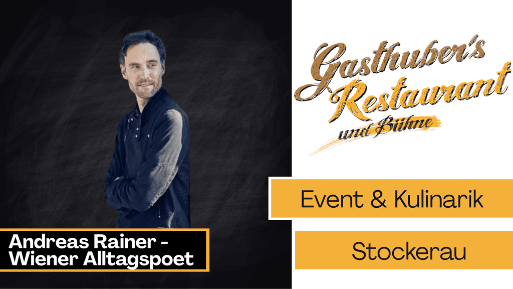 Wir bringen das echte Wiener Lebensgefühl nach Stockerau und begrüßen Andreas Rainer, der Kabarettpreis Gewinner 2025, besser bekannt als "Der Wiener Alltagspoet", erstmals in unserem Saal. Mit seinen charmanten Alltagsbeobachtungen begeistert er online bereits eine Fangemeinde von über 300.000 Followern – nun gibt es seine besten „Gschichtln“ als Vorlesung & Schmäg endlich live zu erleben. Freuen Sie sich auf einen Abend voller Humor und Wiener Herzblut in der gemütlichen Atmosphäre von Gasthubers Restaurant.