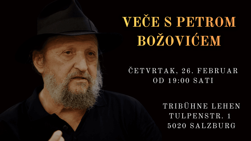 Gostovanje legendarnog srpskog glumca Petra Božovića u Salcburgu donosi publici jedinstveno veče snažne glumačke reči, emocije i umetnosti, u susretu sa jednim od najznačajnijih umetnika našeg prostora.