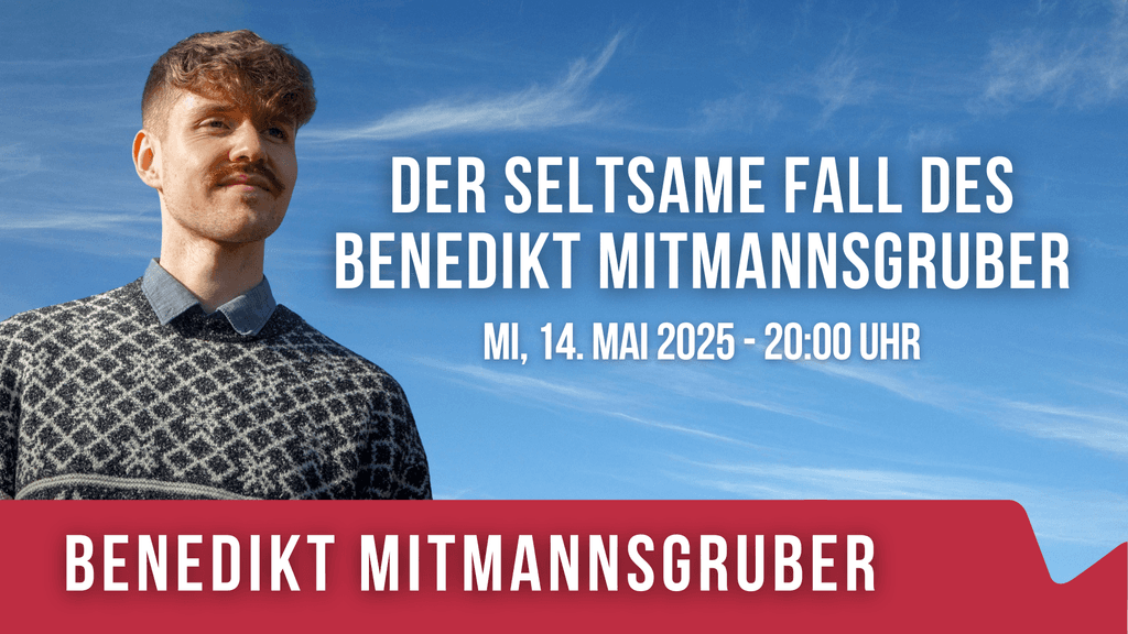 Benedikt Mitmannsgruber ist kein Mann wie alle anderen. Er ist dünn, schwach, hat einen Schnauzbart, trägt einen alten Norwegerpullover und ist ein klassischer Antiheld, ein sensibler Losertyp. Statt ein Haus zu bauen und Vater zu werden, sitzt er mit einer Tasse Johanniskrauttee in einem spärlich eingerichteten Hinterzimmer in einer tristen Großstadt und schreibt lustige Geschichten. Irgendwann begreift seine Familie, dass er nicht altert. Während seine Freunde immer älter werden, Verantwortung übernehmen, Autos kaufen, Kinder zeugen und arbeiten, steckt Mitmannsgruber in der Zeit fest. Er möchte ewig Mitte 20 bleiben. Immer weiter schiebt er das Erwachsenwerden hinaus, bis es unerreichbar und uneinholbar vor ihm liegt. Und dann packt er seine Sachen. Ohne Ziel vor Augen zieht er durch die Bühnen Österreichs und Deutschlands. Er spielt im Fernsehen, gewinnt Preise und bekommt anonym Unterwäsche zugeschickt.