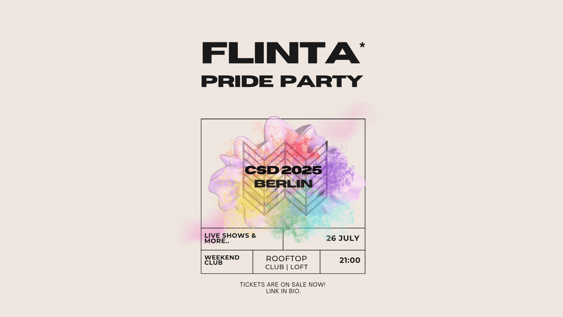 ✨Celebrate diversity, feminism and pride with us at one of Berlin’s most iconic venues – Weekend Club – featuring a club floor, a stylish loft, and the most beautiful rooftop in the city with a BBQ and a cozy handmade market!
