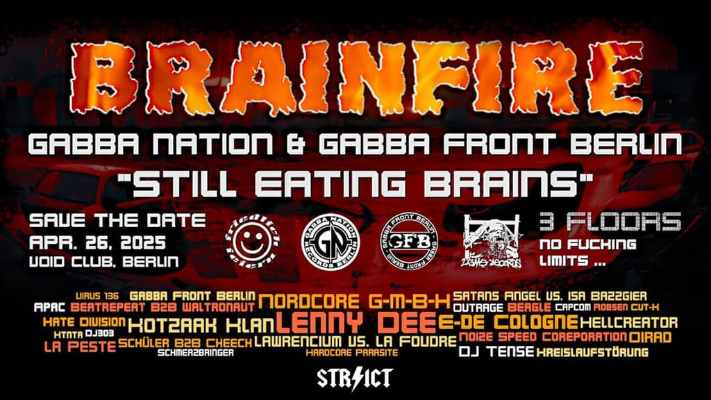 GABBA NATION und GABBA FRONT 2 FLOORS Lenny Dee (US) Label: Industrial Strength Records. Kotzaak Klan (DE) Label: Kotzaak Unltd. Nordcore GmbH (DE) Label: Nordcore Records Hellcreator (NL) Label: Brutal Force Records Apac (NL) Ouwe Stijl is Botergeil Xtnta (CO) Cut-X (DE) Label: Gabba Nation Records E de Cologne (DE) Label: Monotone Records Robsen (DE) Label: Gabba Nation Records Beagle (DE) Label: Gabba Nation Records Gabba Front Berlin (DE) Oirad (IT) Label: No New Style Records Beatrepeat (DE) Label: Gabba Nation Records B2B Waltronaut (DE) Schüler (DE) Label: Flash Fingarz Records B2B Cheech (DE) Hardcore Parasite (DE) Label: Speed Beats Records, DJ 303 (DE) Label: H.A.S.S. 23 Schmerzbringer (DE) Label: Saxony Speedcore Force Outrage (DE)