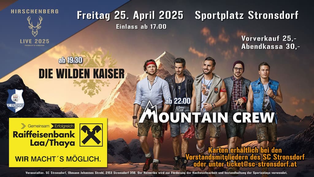Seid dabei, wenn es am 25. April 2025 auf dem Hirschenberg richtig abgeht! Der SC Stronsdorf startet mit seiner neuen Eventreihe „Hirschenberg Live“ und holt hierzu niemand geringeres als die Mountain Crew & die Wilden Kaiser nach Stronsdorf.