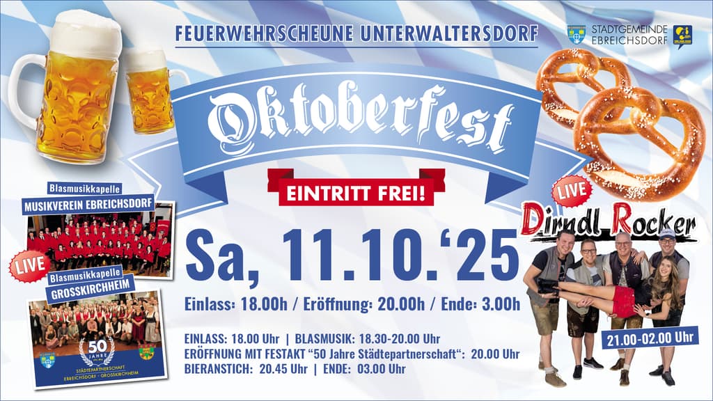 Am Samstag, den 11.10.2025 findet das 8. Oktoberfest der Stadtgemeinde Ebreichsdorf in der Feuerwehrscheune Unterwaltersdorf statt.