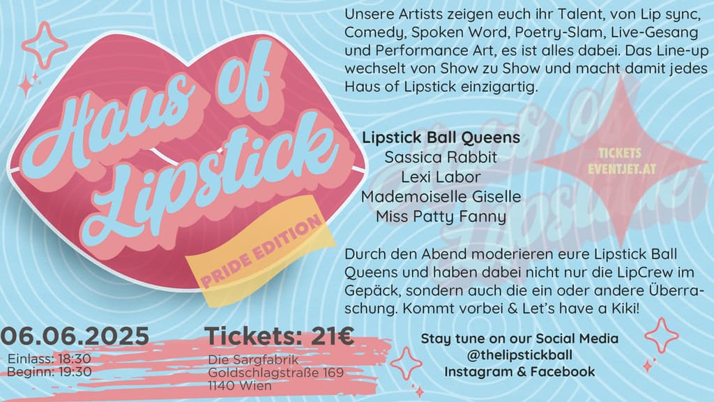 Welcome to the Haus of Lipstick! Unsere Drag Artists zeigen euch ihr Talent, von Lip sync, Comedy, Spoken Word, Poetry-Slam, Live-Gesang und Performance Art, es ist alles dabei. Lasst euch also verführen, wenn unsere „OAGEN“ der Dragkultur ihre besten Darbietungen geben und euch wieder mal in den Bann ziehen.