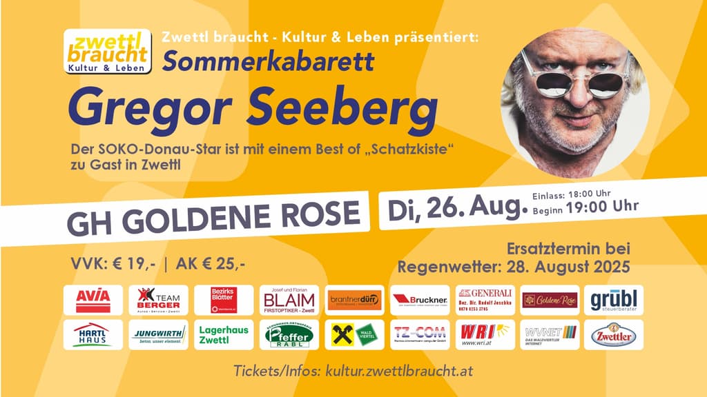 Der Schauspieler (SOKO-Donau, Tatort, Landkrimi etc.) ist seit 2005 auch als Kabarettist unterwegs. In Zwettl ist er mit seinem seinem Best of „Schatzkiste“ zu Gast. Bei Regenwetter wird die Veranstaltung auf 28. August verschoben.