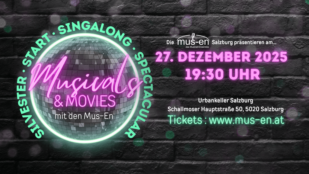 Mit dem Musicals & Movies Singalong bringen die MUS-EN: das Musical-Ensemble Sie nach den besinnlichen Weihnachtsfeiertagen direkt in Silvester-Stimmung. Gute Laune und Party-Vibes sind garantiert wenn Sie sich mit einer bunten Mischung aus weltbekannten Songs, aber auch Musical-Insider-Hits, gemeinsam mit den MUS-EN auf den kommenden Jahreswechsel einstimmen. Und übrigens: Mitsingen ist diesmal nicht nur erlaubt, sondern sogar ausdrücklich erwünscht!