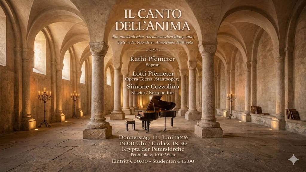 Die Formen der Seele! Lassen wir die Musik dort sprechen, wo die Worte enden! Die Krypta der Peterskirche verwandelt sich an diesem Abend in einen magischen Ort, an dem Musikliebhaber zusammenkommen, um die Klänge klassischer Meisterwerke zu genießen. Die einzigartige Akustik der Krypta verleiht den Darbietungen eine besondere Intensität und lässt die Musik auf eine unvergleichliche Weise lebendig werden. Die Künstler, entführen das Publikum auf eine Reise durch die Epochen, von den sanften Melodien bis hin zu den leidenschaftlichen Kompositionen! Kathi Pfemeter Sopran Lotti Pfemeter Staatsoper Opera Teens Simone Cozollino Klavier/Korrepetitor
