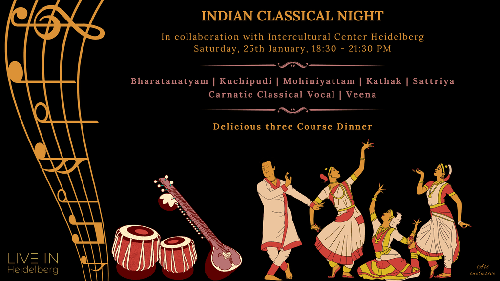 We warmly invite you to the Indian Classical Night, a captivating evening dedicated to the timeless beauty of Indian classical music and dance, brought to you in collaboration with the Intercultural Center of Heidelberg.