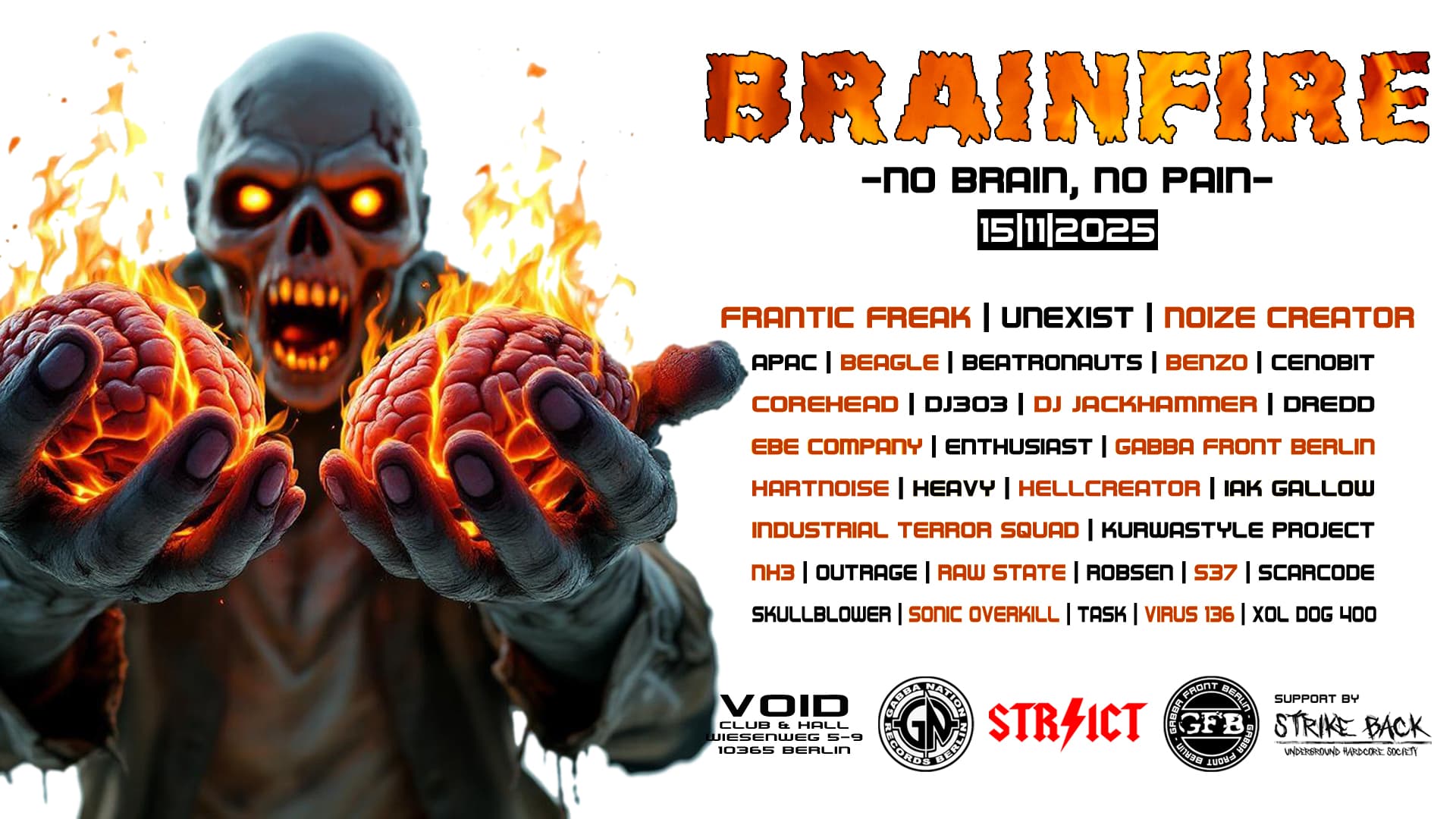 Hirn aus, Bass rein – bis es kracht! BRAINFIRE detoniert am 15.11.2025 im VOID Club Berlin und reißt alles nieder! Unter dem Motto „No Brain No Pain“ liefern die HauptActs Unexist (IT), Frantic Freak (NL) mit einem exklusiven 2-Stunden-Spezial-Set und Noize Creator (DE) ein Hardcore-Bombardement, das deine Schädeldecke sprengt!
