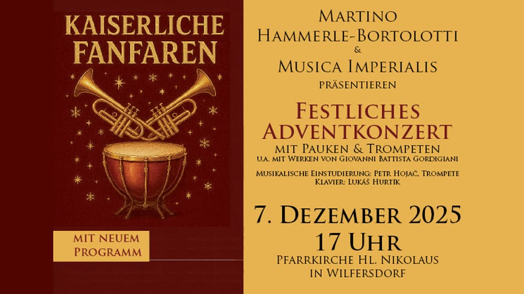 Das festliche Adventkonzert "Kaiserliche Fanfaren" mit Pauken und Trompeten, u. a. mit Werken von Giovanni Battista Gordigiani, wird dem Publikum in einer wunderbaren Darbietung von Martino Hammerle-Bortolotti (Bariton), Lukáš Hurtík (Klavier) und Musica Imperialis, einem Trompetenensemble der Brünner Philharmoniker und Studierenden der Musikhochschule Brünn, präsentiert.