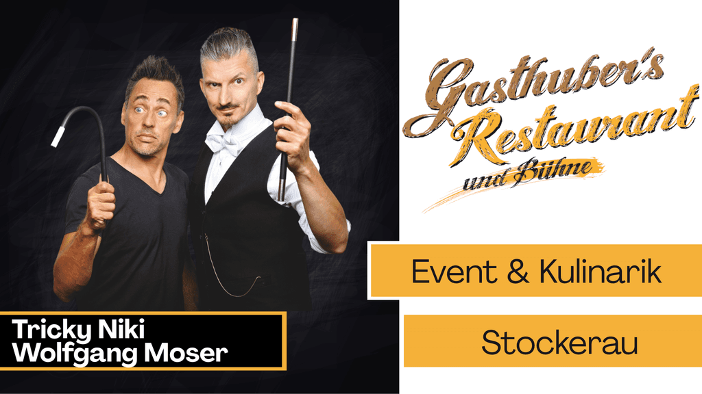 Tricky Niki begeistert mit wortlosem Humor, verblüffender Magie und feinem Witz – international gefeiert und unverwechselbar in seiner Art. Wolfgang Moser zählt zu den besten Mentalisten Österreichs und fasziniert mit Gedankenlesen, Psychologie und überraschenden Wendungen. Gemeinsam sorgen sie für eine einzigartige Mischung aus Staunen, Lachen und Gänsehaut. Beide haben bereits bei uns gespielt – umso mehr freuen wir uns, sie wieder bei uns im Restaurant begrüßen zu dürfen.