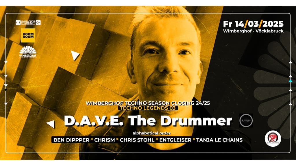 Am 14. März 2025 wird der Wimberghof zur pulsierenden Techno-Oase. "Techno Legend", DJ und Produzent D.A.V.E. The Drummer, berühmt für seinen charakteristischen Sound, gibt sich die Ehre. Unterstützt wird er dabei von einem nationalen Line-up der Spitzenklasse. Erlebe eine Nacht voller kraftvoller Techno-Beats in einem einzigartigen Ambiente.