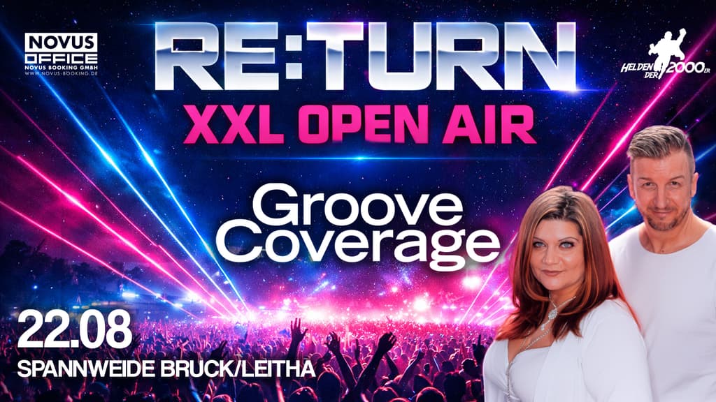 RE:TURN XXL OPEN AIR presents GROOVE COVERAGE - LIVE 22.08. Spannweide Bruck an der Leitha Eine Nacht. Eine Generation. Ein Sommermoment. Im Rahmen ihrer 25 Years World Tour machen Groove Coverage einen exklusiven Zwischenstopp in Bruck an der Leitha – bei RE:TURN Open Air XXL auf der Spannweide. Erlebe eine der prägendsten Eurodance-Acts der 2000er live unter freiem Himmel. Von Moonlight Shadow über Poison bis God Is A Girl – Hit auf Hit, Erinnerungen inklusive. RE:TURN steht für große Emotionen, starke Sounds und echte Open-Air-Vibes. Ein Abend zum Feiern, Mitsingen und Zurückerinnern – gemeinsam mit tausenden Gleichgesinnten. Weitere Hits: The End - 7 Years & 50 Days - SHE - Runaway - Holy Virgin - On the Radio - 21st Century Digital Girl - Because i love you - Innocent - Angeline - Think about the Way - Riot on the Dancefloor - Wait - Million Tears - Wake Up – Higher Energy – Monsters in my Head – In my Eyes – No Control LINE UP: • GROOVE COVERAGE - LIVE • Chris Thor • DJ Golemo