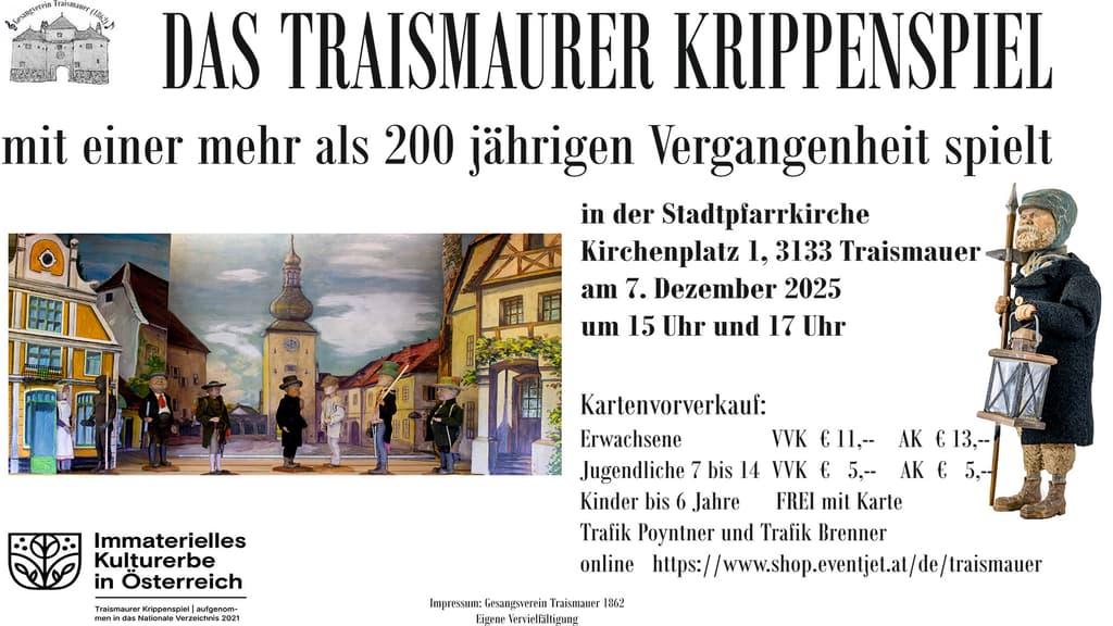 Das Traismaurer Kripperl ist ein Puppentheater mit mehr als 200jähriger Tradition. Heuer wird es in der Stadtpfarrkirche Traismauer am Sonntag, 7.12. 2025, um 15 Uhr und um 17 Uhr aufgeführt. Die Krippenspielschar des Gesangverein Traismauer (1862) freut sich schon auf Ihren Besuch!