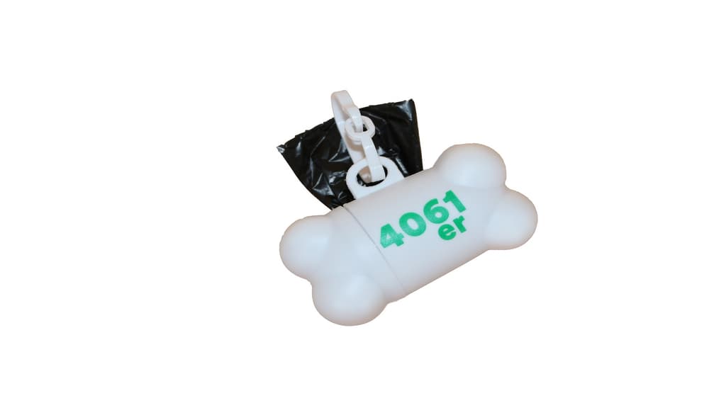 Gack-Sack im "Hundeknochen" mit Befestigungsmöglichkeit für Schlüsselbund, Leine, etc. Preis Preis bei Selbstabholung im Rathaus.