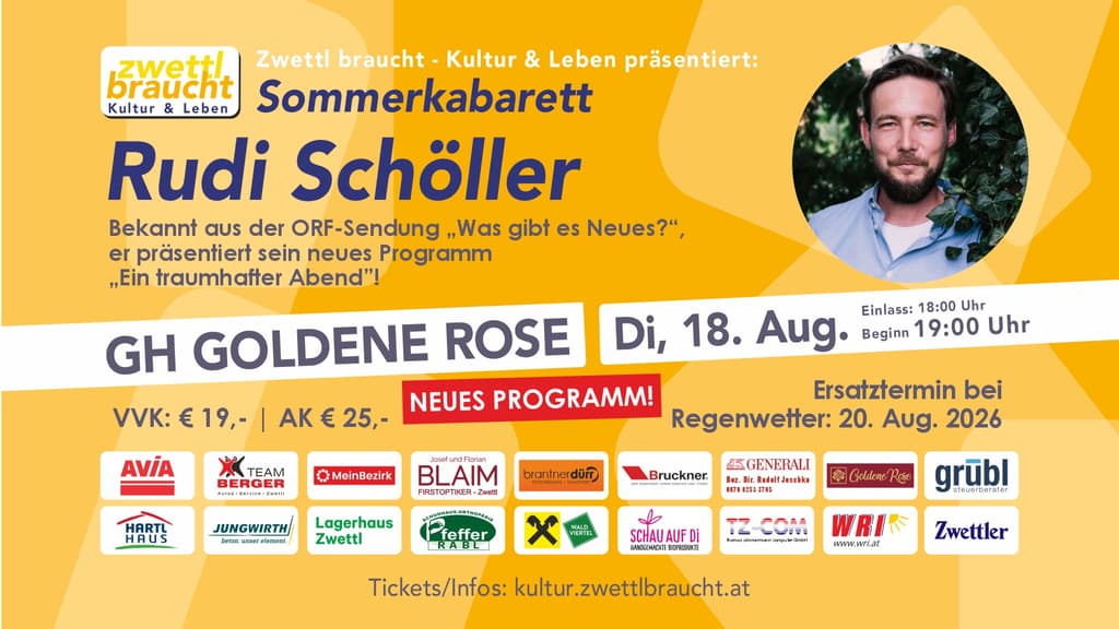 Rudi Schöller ist als Stammgast im ORF (”Was gibt es #neues?” oder „Pension Schöller”) bekannt und war schon unzählige Male in Zwettl: Nicht nur mit seinen bisherigen Soloprogrammen sondern auch als Moderator des Waldviertler Kabarettpreises. Nun hat er selbst wieder ein neues Programm und präsentiert dieses im Gasthaus zur Goldenen Rose - Titel: „Ein traumhafter Abend” - genau auf einen solchen freuen wir uns gemeinsam mit unseren Gästen. Bei Regenwetter findet die Veranstaltung am 20. August statt!