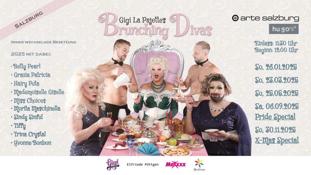 Das weltweite Phänomen Drag Brunch hat nun endlich auch in Salzburg Fuß gefasst. Die Besucher*innen brunchen in einer einzigartigen Location im hu:goes14 im arte Hotel auf der 14. Etage während Drag Queens aus ganz Österreich & Süddeutschland aus ihrem unterhaltsamen, glamourösen und bunten Repertoire auf der wohl höchsten Bühne Salzburgs performen.