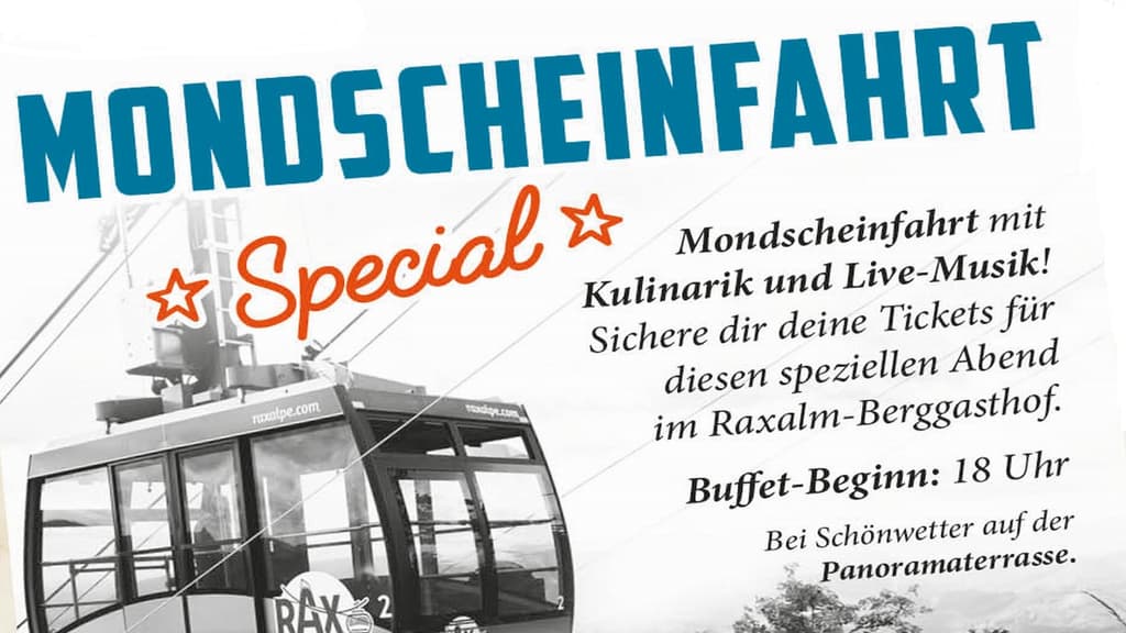 Genieße ein Glas Prosecco zum Start in diesen Abend auf der Rax. Lass' dich von Köstlichkeiten vom Berglandbuffet kalt und warm auf der Panoramaterrasse des Raxalm-Berggasthofes (bei Schönwetter) verwöhnen und lausche der Live-Musik im Hintergrund. Nach gemütlichen Stunden geht es bei Mondenschein mit der Rax-Seilbahn zurück ins Tal. Ein unvergesslicher Abend auf der Raxalpe!