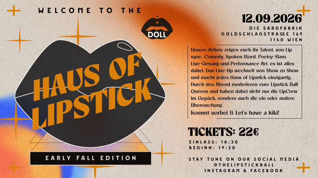 Welcome to the Haus of Lipstick! Unsere Drag Artists zeigen euch ihr Talent, von Lip sync, Comedy, Spoken Word, Poetry-Slam, Live-Gesang und Performance Art, es ist alles dabei. Lasst euch also verführen, wenn unsere „OAGEN“ der Dragkultur ihre besten Darbietungen geben und euch wieder mal in den Bann ziehen.