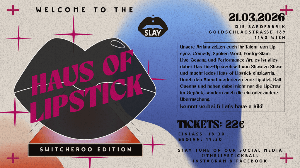 Welcome to the Haus of Lipstick! Unsere Drag Artists zeigen euch ihr Talent, von Lip sync, Comedy, Spoken Word, Poetry-Slam, Live-Gesang und Performance Art, es ist alles dabei. Lasst euch also verführen, wenn unsere „OAGEN“ der Dragkultur ihre besten Darbietungen geben und euch wieder mal in den Bann ziehen.