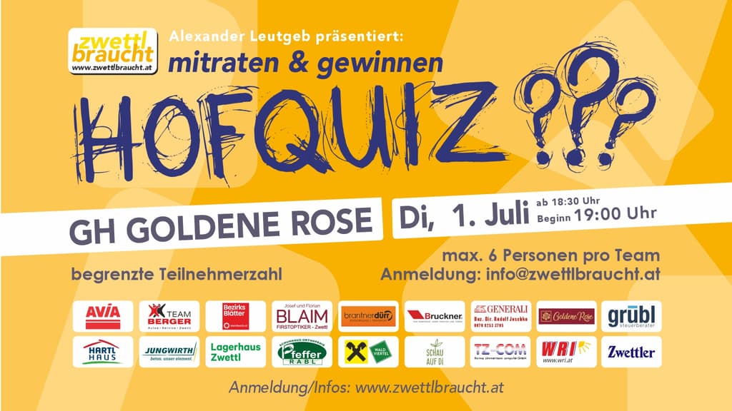 Die Teilnahme am Hof-Quiz ist kostenlos. Alles was du brauchst sind bis zu fünf Freunde und kreative sowie bestenfalls richtige Antworten zu verschiedenen Wissensgebieten. Mit dem Ticket reserviertst du einen Tisch für bis zu sechs Personen. Wir freuen uns auf einen spannenden Rätselabend. Die besten Teams gewinnen tolle Preise.